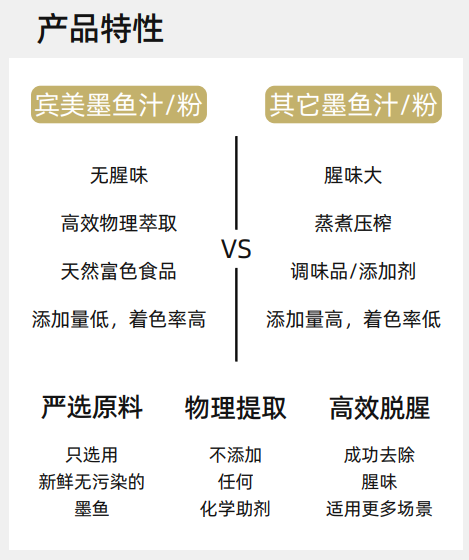 宾美墨鱼汁粉采用了独有的高效物理脱腥工艺,成功去除了墨鱼汁中的腥味成分。